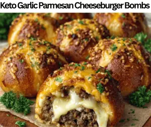 These Keto Garlic Parmesan Cheeseburger Bombs contain a juicy and crispy texture. We prepare these cheeseburger bombs with mozzarella cheese, onion powder, ground beef, black pepper, oregano, garlic powder, almond flour, Parmesan cheese, salt, parsley, egg, bacon, butter, and cream cheese. These are common items present in our kitchen storage areas. You could just buy all of the essential materials at the supermarket. These bombs have 320 kcal and 4 grams of net carbs. We make these cheeseburger bombs in 45 minutes. These Keto Garlic Parmesan Cheeseburger Bombs are ideal for snacks, breakfasts, sides, lunches, parties, appetizers, events, gatherings, dinners, and desserts. You can serve these cheeseburger bombs with avocado and tomato salad, crispy bacon bits, or creamy mustard dip.