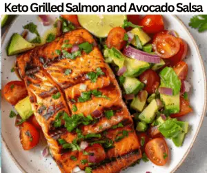 Keto Grilled Salmon and Avocado Salsa is a light yet decadent dish. It is ideal for a nutritious low-carb dinner. We lightly season the salmon with olive oil, lemon, & smoky spices, then it is grilled till it is flaky & delicate on the inside with a crispy golden. Then we place the delicious and refreshing avocado salsa consisting of avocados, red onion, lime, cilantro, and cherry tomatoes over the salmon. Warm, flavorful salmon and chilly, tart salsa combine to produce a harmonious blend of flavors and textures that are refreshing and filling. Every bite of this Grilled Salmon and Avocado Salsa is rich in healthy fats, protein, & freshness.
