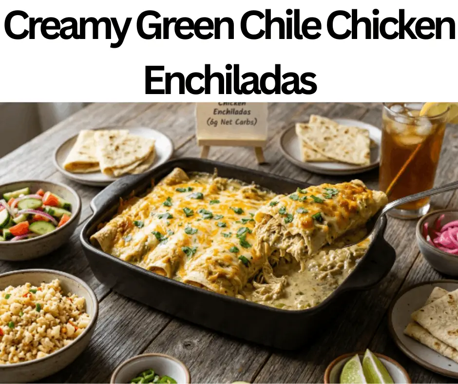These Keto Creamy Green Chile Chicken Enchiladas have a tender and cheesy texture. We prepare these enchiladas with chicken, cream cheese, onion powder, cheddar cheese, chili powder, Monterey Jack cheese, sour cream, garlic powder, green chiles, pepper, keto tortillas, cumin, and cilantro. These enchiladas contain 420 calories and six grams of net carbs. We need almost forty minutes to make these enchiladas. These Keto Creamy Green Chile Chicken Enchiladas are good for weekend festivities, starters, functions, morning meals, gatherings, parties, casual dining, occasions, and dinners. We store these enchiladas in the freezer for almost thirty to sixty days. You can serve these enchiladas with Mexican cauliflower rice, cucumber tomato salad, shredded cheese, almond flour flatbread, unsweetened iced tea, or pickled red onions.
