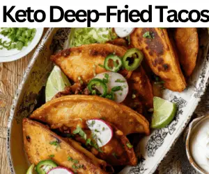 These Keto Deep-Fried Tacos have a savory flavor and a cheesy flavor. We prepare these tacos with mozzarella cheese, almond flour, garlic powder, egg, cumin, heavy cream, ground beef, cheddar cheese, paprika, pepper, oil, and salt. These tacos contain 320 calories and four grams of net carbs. We make these tacos in only thirty-five minutes. These Keto Deep-Fried Tacos are excellent for starters, busy days, sides, morning breakfasts, functions, special parties, family get-togethers, friends’ events, dinners, and snacks. We store these tacos in a freezer for about 30 days, so you can prepare them earlier. You can serve these tacos with Cheese Queso Dip, Cauliflower Rice, Shredded Lettuce, or Iced Unsweetened Tea.