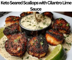These Keto Seared Scallops with Cilantro Lime Sauce are a crispy recipe. We prepare these scallops with large sea scallops, black pepper, butter, fresh cilantro, lime zest, olive oil, salt, mayonnaise, lime juice, and garlic. These scallops contain 280 calories and two grams of net carbs. We make these scallops in just twenty minutes. These Keto Seared Scallops with Cilantro Lime Sauce are ideal for breakfasts, occasions, events, sides, lunches, functions, gatherings, parties, appetizers, and dinners. We do not recommend storing these scallops, as they will lose texture and become rubbery. But you can prepare them earlier, because they easily refrigerate for two days. You can serve these scallops with roasted zucchini with Parmesan, avocado cucumber salad, and keto garlic butter mushrooms.